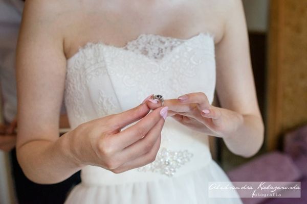Przyznam szczerze, że mieliśmy farta! To jest właściwie długa historia. Robiliśmy je na zamówienie z własnego złota, które otrzymaliśmy od babci, i udało się też tym własnym złotem ogarnąć robociznę. Więc my za obrączki nie zapłaciliśmy właściwie w ogóle. Ale nie jesteśmy z nich zadowoleni i w przyszłości planujemy zmienić na platynowe obrączki ślubne. Natomiast jeżeli chodzi o moje dodatki – biżuterię, kolczyki, bransoletka, naszyjnik. Zamówiłam w YES z perłami i zapłaciłam dokładnie 257zł.